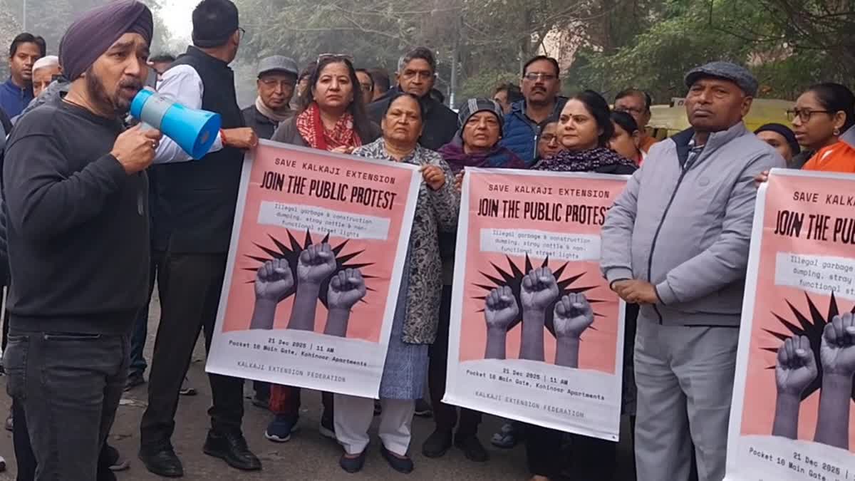 दिल्ली के कालकाजी एक्सटेंशन में कूड़े का अंबार और कंस्ट्रक्शन मैटेरियल अवैध तरीके से सड़क पर डालने को लेकर विरोध प्रदर्शन किया गया है.